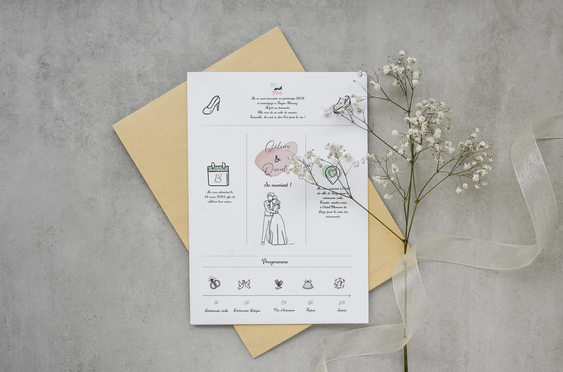 Du choix des couleurs à la typographie, en passant par le format et les illustrations, chaque détail est pensé pour raconter votre histoire. Ensemble, nous créons un faire-part qui reflète votre univers et qui marquera les esprits dès la première impression.