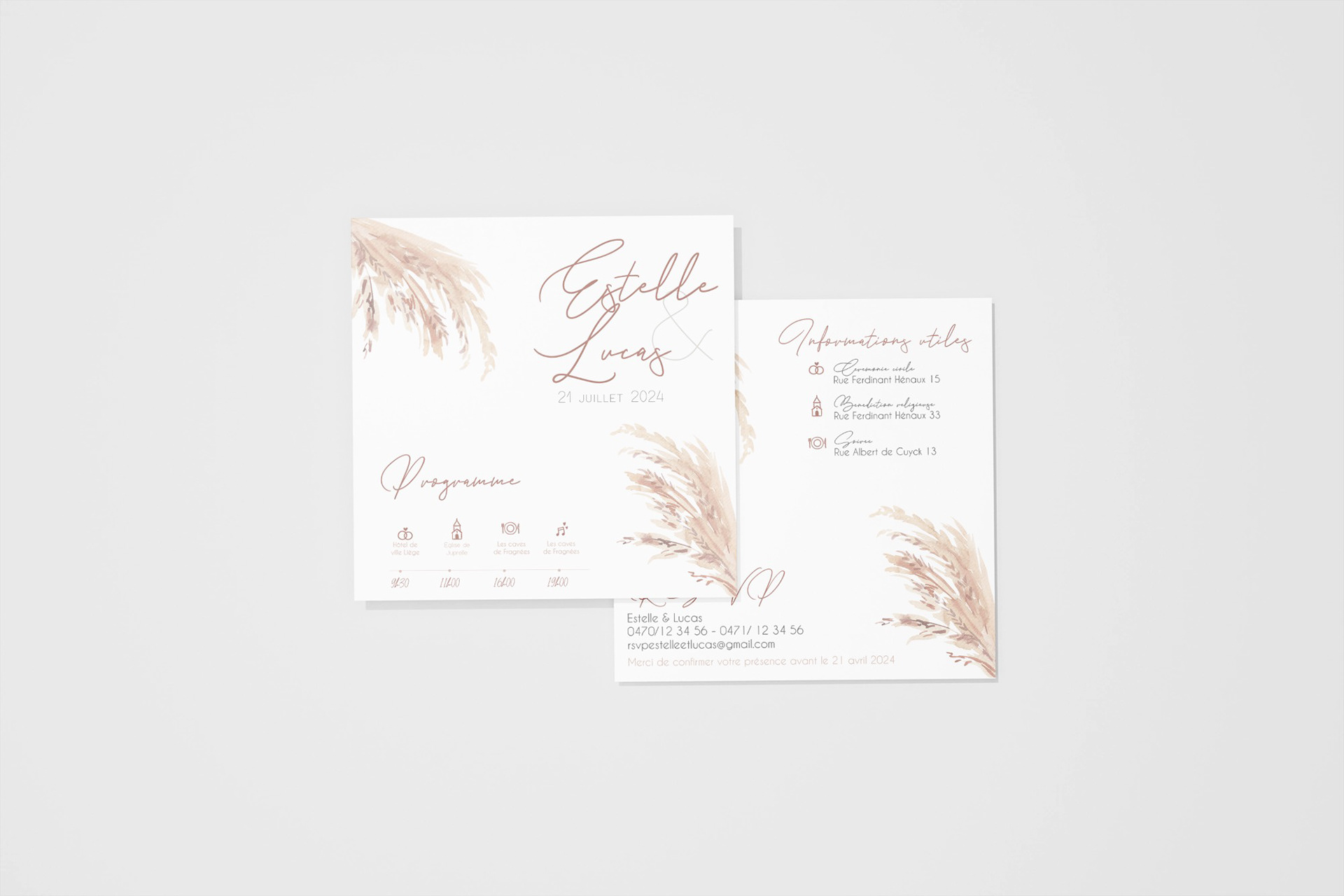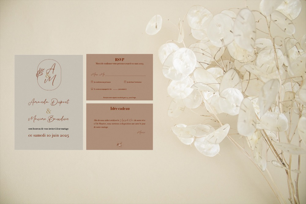 Que vous souhaitiez un design romantique, bohème, minimaliste ou vintage, je m’adapte à vos envies pour donner vie à vos idées. Tous les faire-part sont réalisés avec soin, imprimés sur des papiers de qualité, et peuvent être complétés par des éléments assortis : menus, cartons d’invitation, livrets de cérémonie, étiquettes, etc.